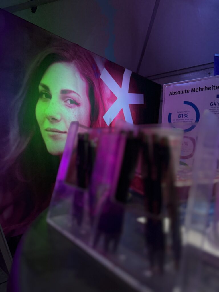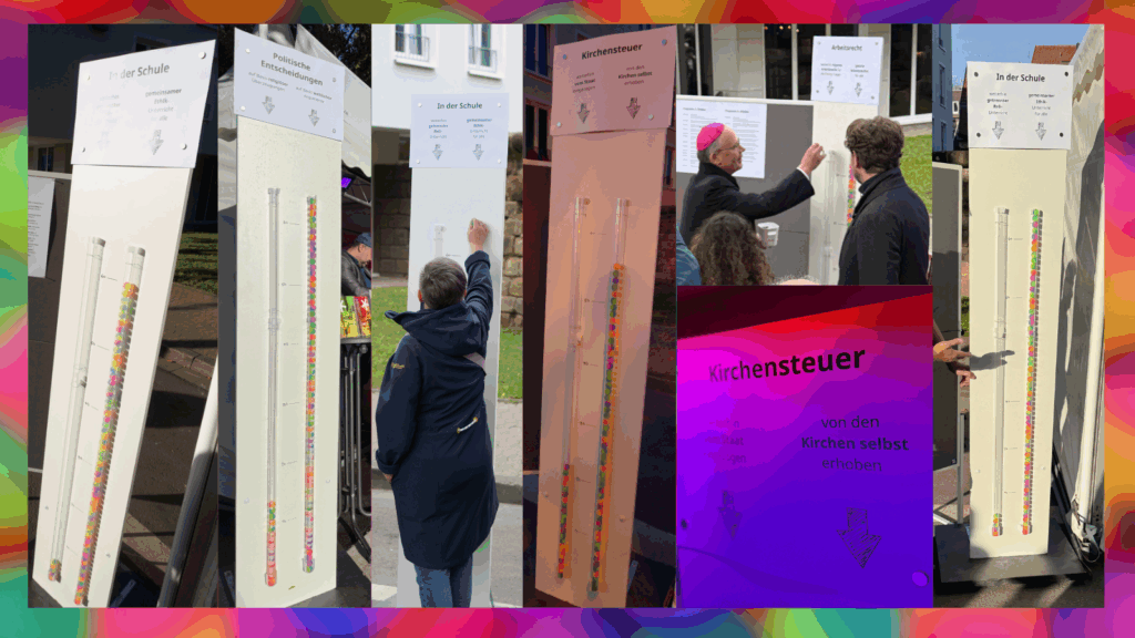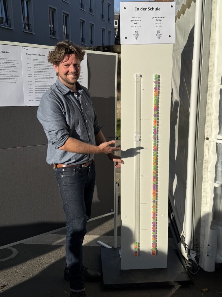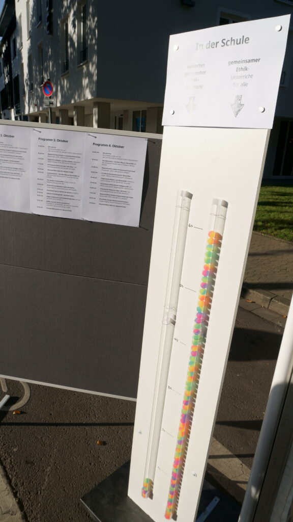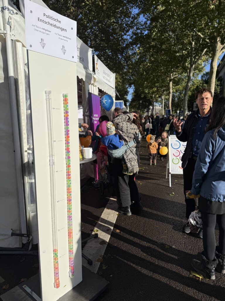 „Die Abstimmungen mit bunten Flummis sind eine spielerische Möglichkeit, mit den Menschen ins Gespräch zu kommen”, sagt Möller. „Zu Religion haben die Menschen sehr verschiedene Meinungen. Wenn es aber um die Vermengung von Religion und Politik geht, zeigen sich die absoluten Mehrheiten für einen säkularen Staat, die wir auf unserem Plakat dargestellt haben.”