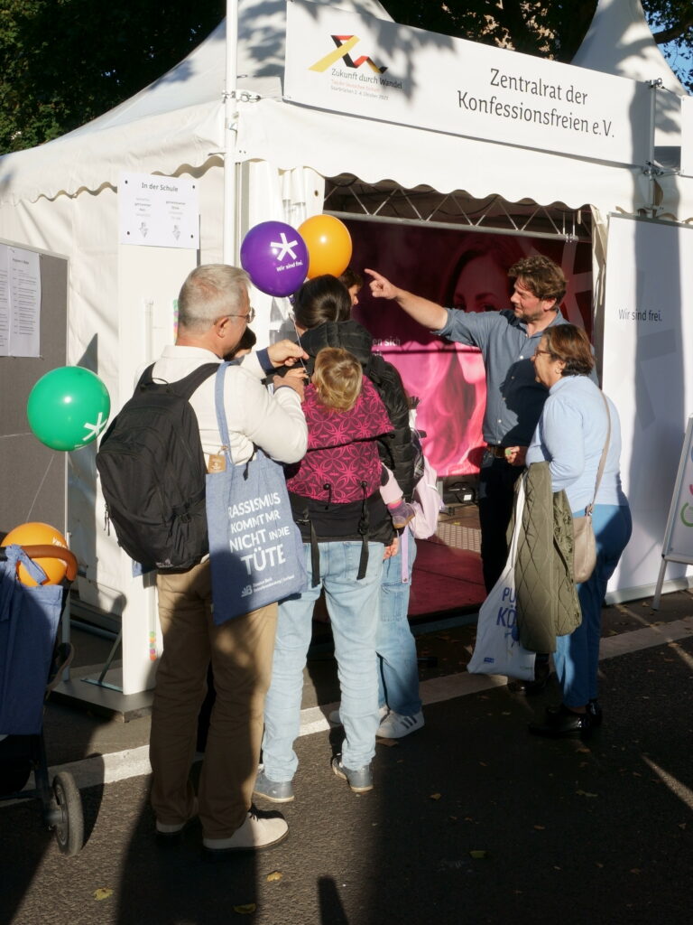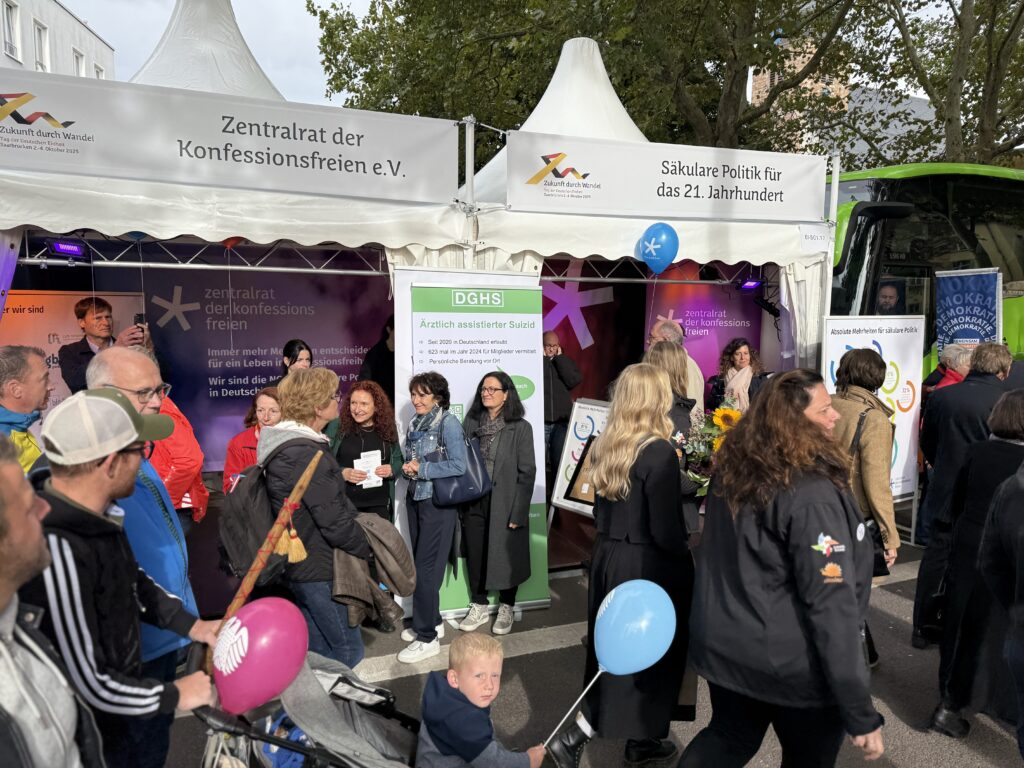 Laut Veranstalter besuchten etwa 400.000 Menschen das Bürgerfest rund um die Feierlichkeiten zum Tag der Deutschen Einheit 2025 (TDE 25) in Saarbrücken. Der Zentralrat der Konfessionsfreien wurde von Mitgliedsverbänden und Partnern unterstützt und war so mit einem zwölfköpfigen Team präsent: