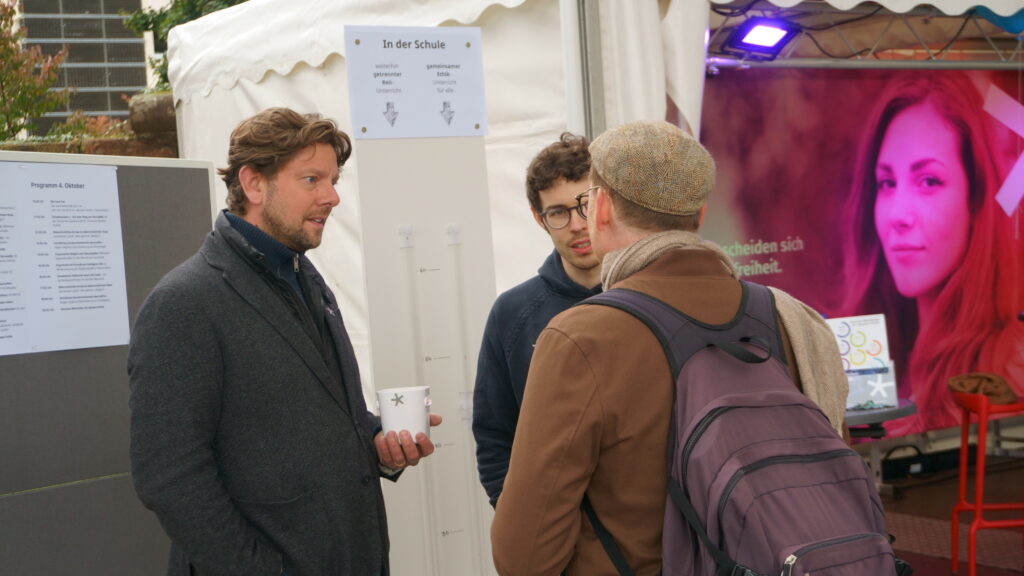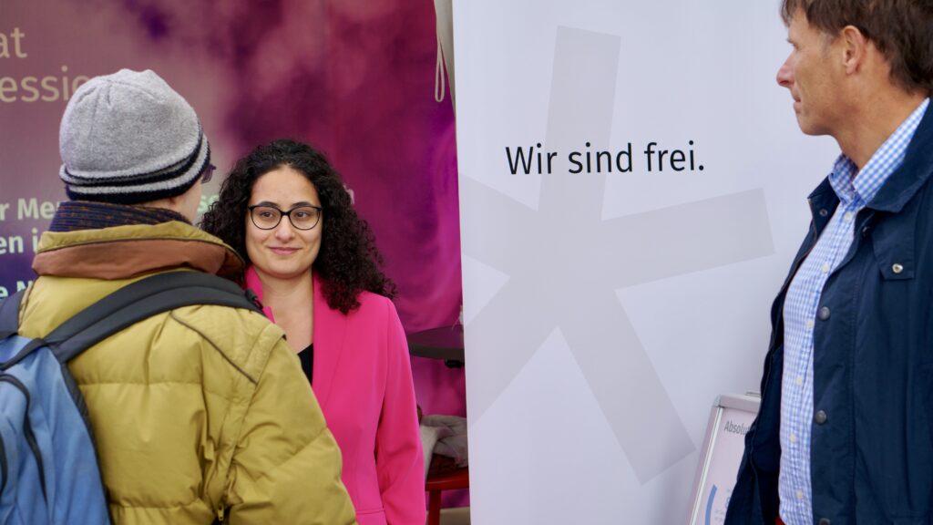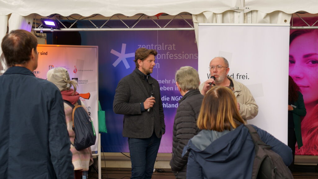 Aus dem Leitungsteam der Ex-Muslime war Zeinab Herz mit zwei weiteren Mitstreitern vor Ort. Sie führten zahlreiche Gespräche mit Besuchern des Standes. „Für viele Menschen ist es neu, Erfahrungen mit Islamismus in der eigenen Familie aus erster Hand zu hören”, sagt Herz. Ihr Kollege ergänzt: „Als schwuler Ex-Muslim bin ich gleich doppelt herausgefordert”, ergänzt Nabhi Agha. „Es ist total befreiend, dass wir mit den Ex-Muslimen eine Community von Menschen gründen können, die das gleiche Schicksal teilen.”