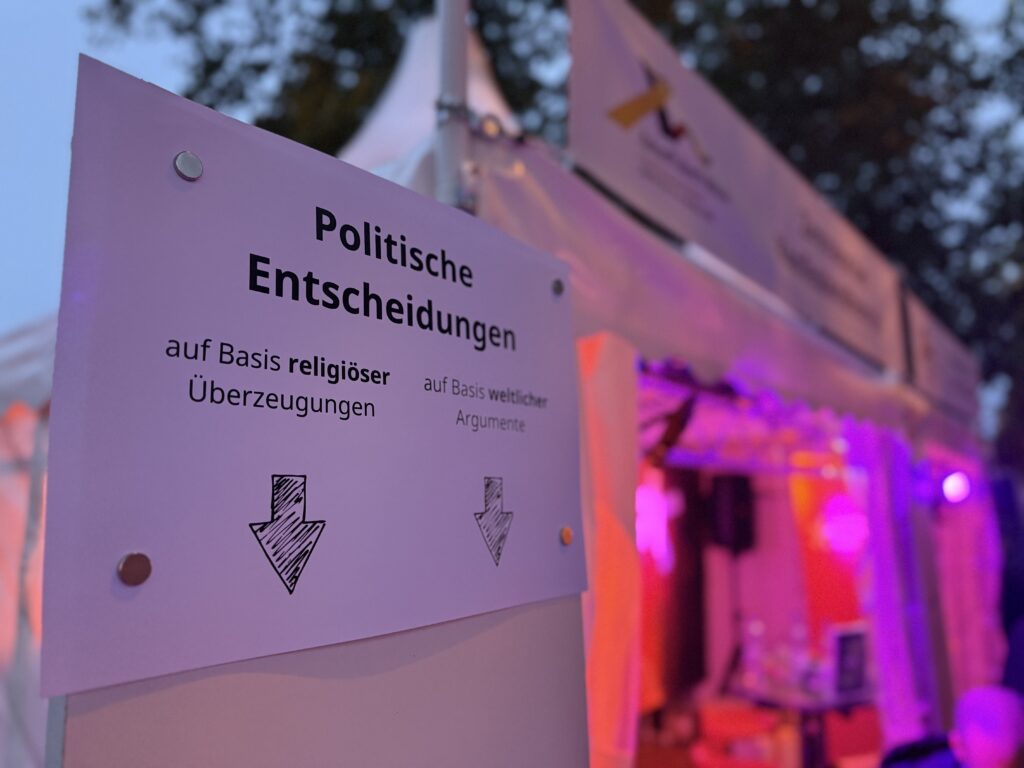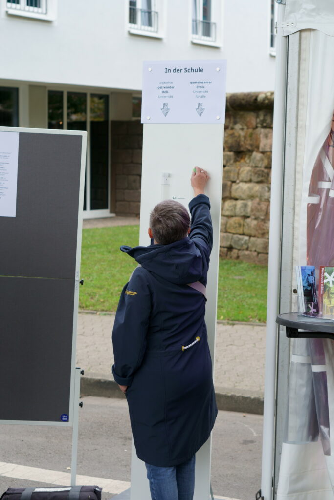 Mit verschiednen Fragen zum Verhältnis von Staat und Religion bat das Team die Besucherinnen und Besucher des Bügerfestes um ihre Meinungen. Die Befragung fand über jeweils zwei mögliche Antworten statt.