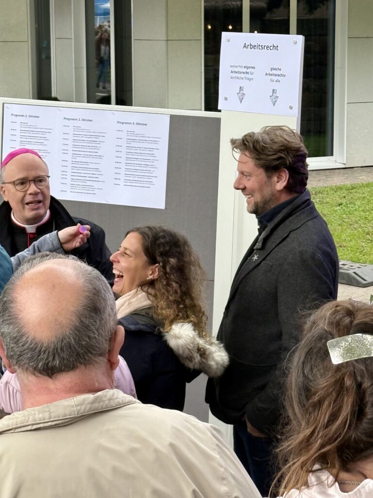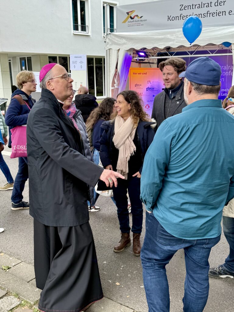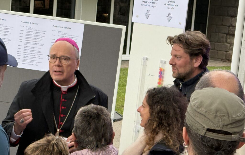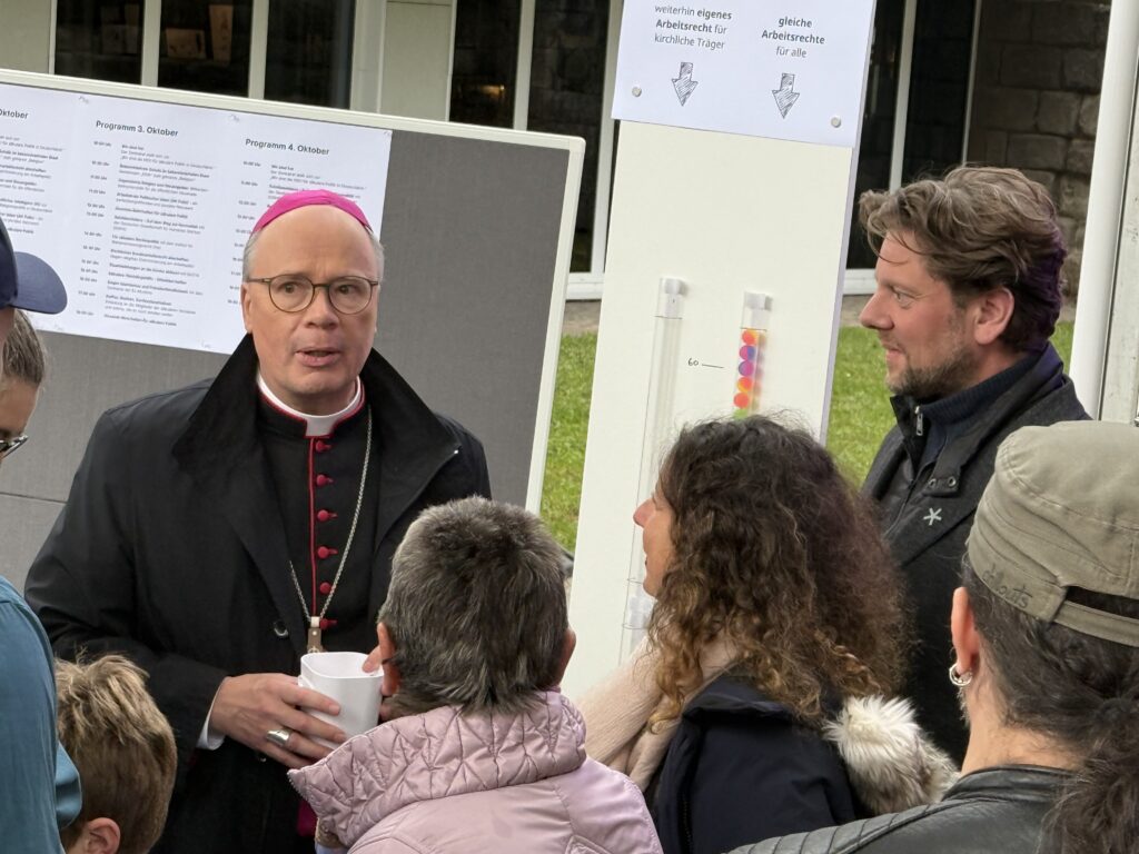 Echte Gegensätze taten sich auf, als der Trierer Bischof Stephan Ackermann den Infostand besuchte. In einer Gruppe mit Dr. Jessica Hamed vom ifw und David Farago von der Aktionsgruppe „11. Gebot” sprach Möller mit dem Bischof anfänglich über die sexuelle Gewalt in kirchlichen Einrichtungen. „Dass ein leitender Angestellter wie Herr Ackermann den Missbrauchsskandal in seinen eigenen Reihen verharmlost, in dem er auf sexuelle Gewalt etwa in Sportvereinen hinweist, hat mich nicht überrascht”, so Möller.