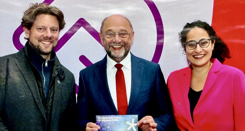 „Der säkulare Blick auf die EU ist wirklich spannend”, berichtet Möller, „weil europäische Gesetzgebung häufig viel zeitgemäßer ist als deutsche – insbesondere beim Arbeitsrecht, das die religiöse Diskriminierung durch die deutsche Sonderregelung streng untersagt.” Zeinab Herz ergänzt: „Der Politische Islam stellt für ganz Europa eine riesige Herausforderung dar. Ich bin sehr glücklich, dass wir mit dem AK Polis Teil eines Netzwerks sind, das zum Beispiel auch mit Organisationen in Österreich und Frankreich kooperiert.” Für ein gemeinsames Bild nahm Martin Schulz auch den Flyer „absolute Mehrheiten für säkulare Politik” in die Hand.