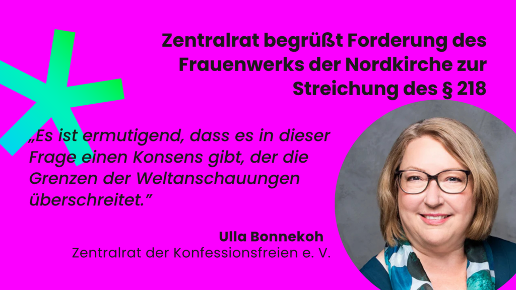Seit 1871 steht der Schwangerschaftsabbruch im Strafgesetzbuch – ein Gesetz, das in einer Zeit entstand, in der Frauen weder wählen noch Verträge schließen durften und das bis heute wirkt wie ein Fremdkörper in einem modernen Rechtsstaat. „Die Forderung nach der Streichung des § 218 aus dem Strafgesetzbuch und seiner Ersetzung durch eine weltanschaulich neutrale Regelung entspricht dem, was eine plurale und liberale Gesellschaft den Frauen seit Langem schuldet“, sagt Ulla Bonnekoh, zweite Vorsitzende des Zentralrats der Konfessionsfreien. „Das Frauenwerk vertritt eine konsequent menschenrechtliche Perspektive – und es ist ermutigend, dass es in dieser Frage einen Konsens gibt, der die Grenzen der Weltanschauungen überschreitet.“